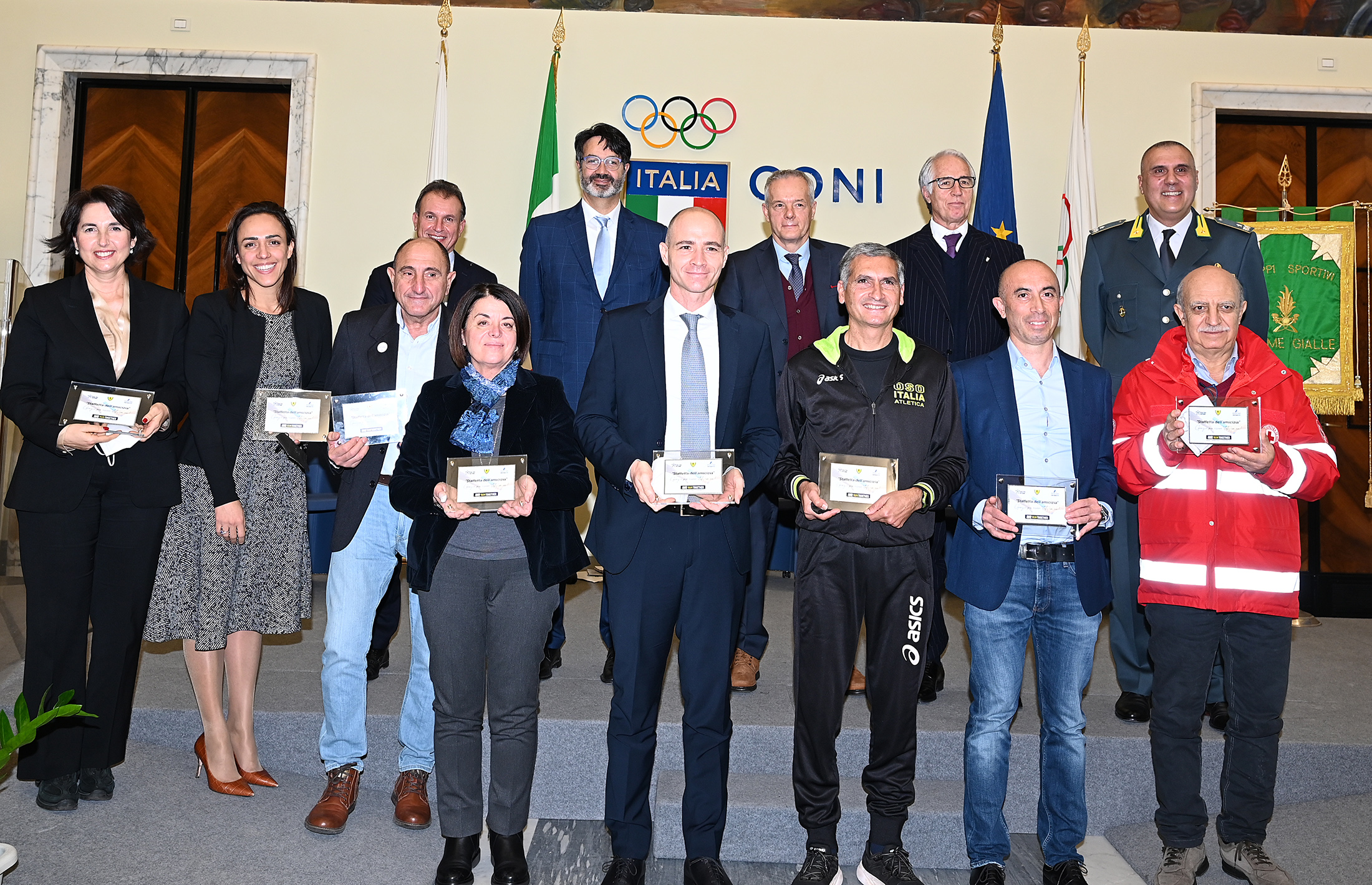 - ai rappresentanti delle squadre che hanno partecipato alla “Staffetta dell’Amicizia” nel corso del meeting “We run togheter”: Chiara Porro per Atletica Vaticana, Fabrizio Sprega per Special Olympics, Giovanni Kheiraoui per la Croce Rossa Italiana, Daniele Frongia per il Team Governo, Salvatore Aloe per Roma Capitale, Alessia Rampazzi per Casa Circondariale Roma Rebibbia, Maria Donata Iannantuono per Casa Circondariale Velletri, e Salvatore Nicosia per Fiamme Gialle All Stars.