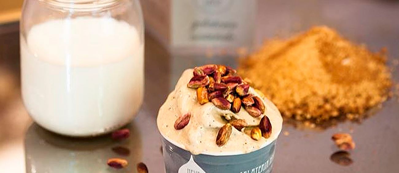 Pistacchio di Bronte 100%, la gelateria lo propone sia nella sua versione al latte cremoso e classico che nella sua versione vegana a base di acqua, olio di cocco e zucchero di canna grezza di barbabietola, per concederci qualcosa di goloso ma leggero anche con l'arrivo dell'estate.