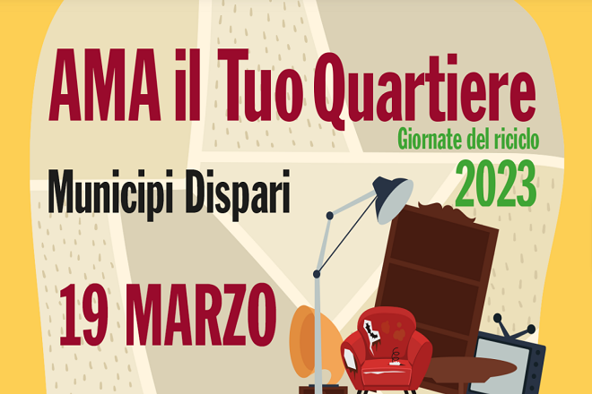 Domenica 19 marzo, Ama S.p.A. organizza, in collaborazione con il TGR Lazio, l’iniziativa “Ama il tuo Quartiere - Giornate del Riciclo” con postazioni straordinarie, oltre ai Centri di raccolta, per incentivare la raccolta differenziata gratuita dei seguenti materiali: legno, metallo, ingombranti, frigoriferi e condizionatori, grandi elettrodomestici, monitor e TV, apparati elettronici, lampade al neon, batterie al piombo, consumabili da stampa, e in alcuni punti contenitori di vernici e solventi.