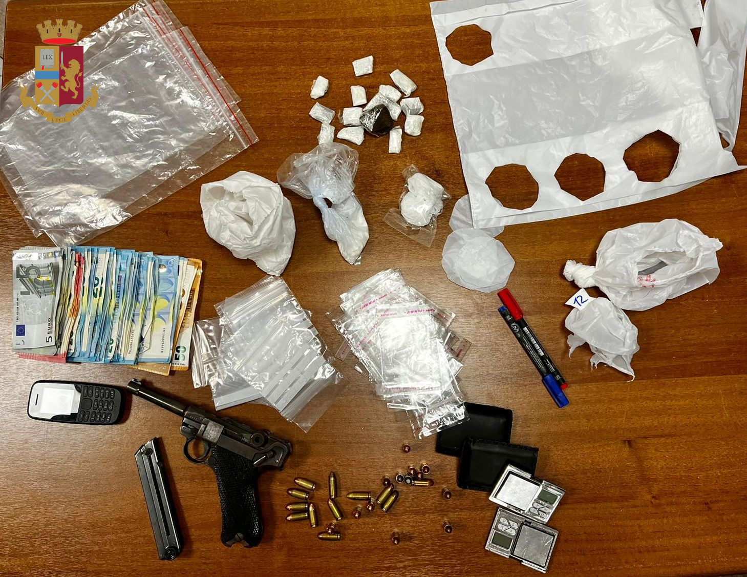 L’immediata perquisizione dell’immobile ha permesso di rinvenire una pistola semiautomatica calibro 9 e 25 cartucce, 4 bilancini di precisione, circa 19 grammi di cocaina, 64 grammi di mannite utilizzate per il taglio e 20 grammi di cristalli. La perquisizione domiciliare ha portato al sequestro di 43 grammi di hashish, 1000 euro in contanti e 2 quaderni con cifre nomi e numeri, riconducibile all’attività di spaccio. Dopo la convalida dell’arresto per il giovane è stata disposta la custodia cautelare agli arresti domiciliari con braccialetto elettronico.