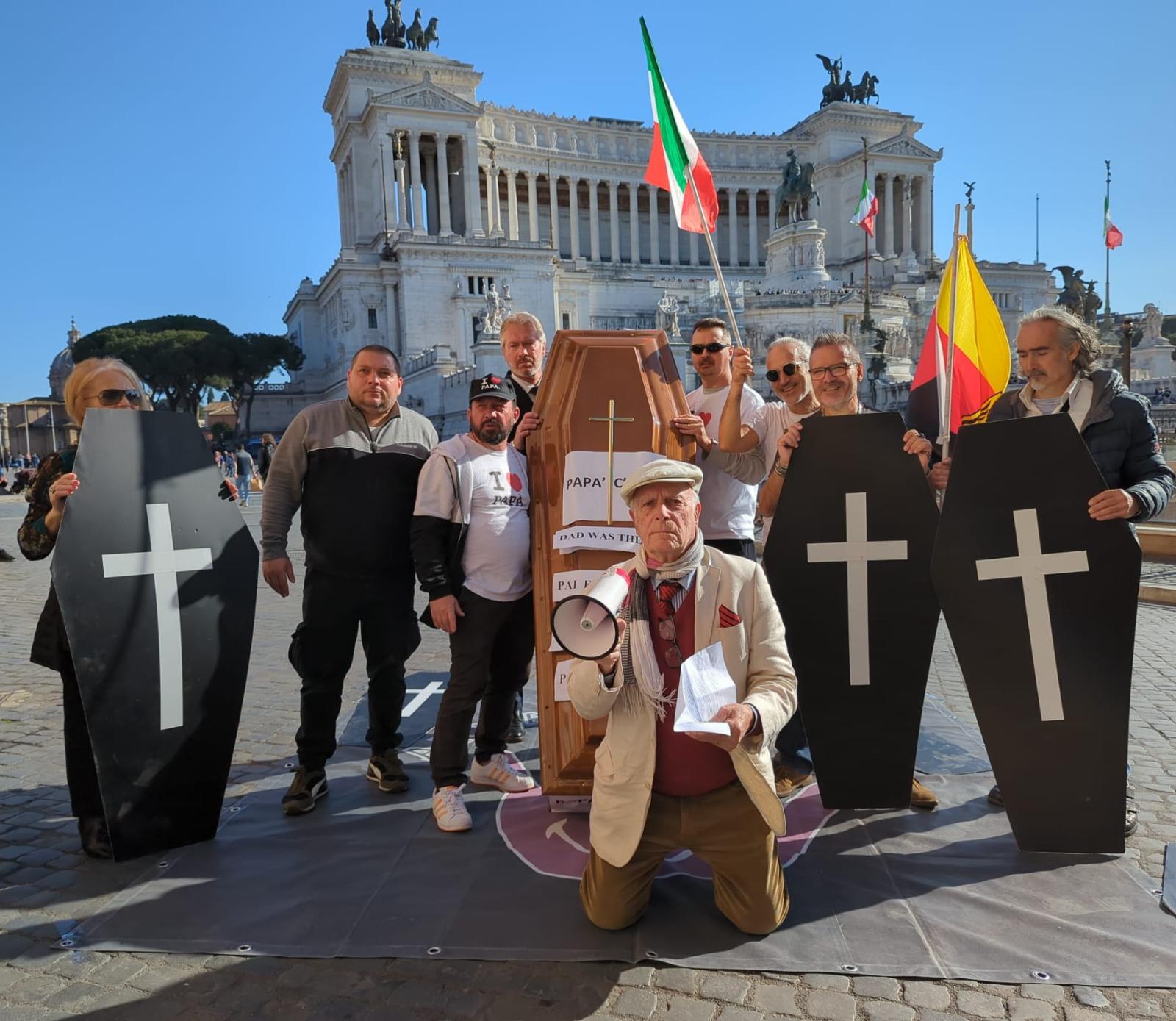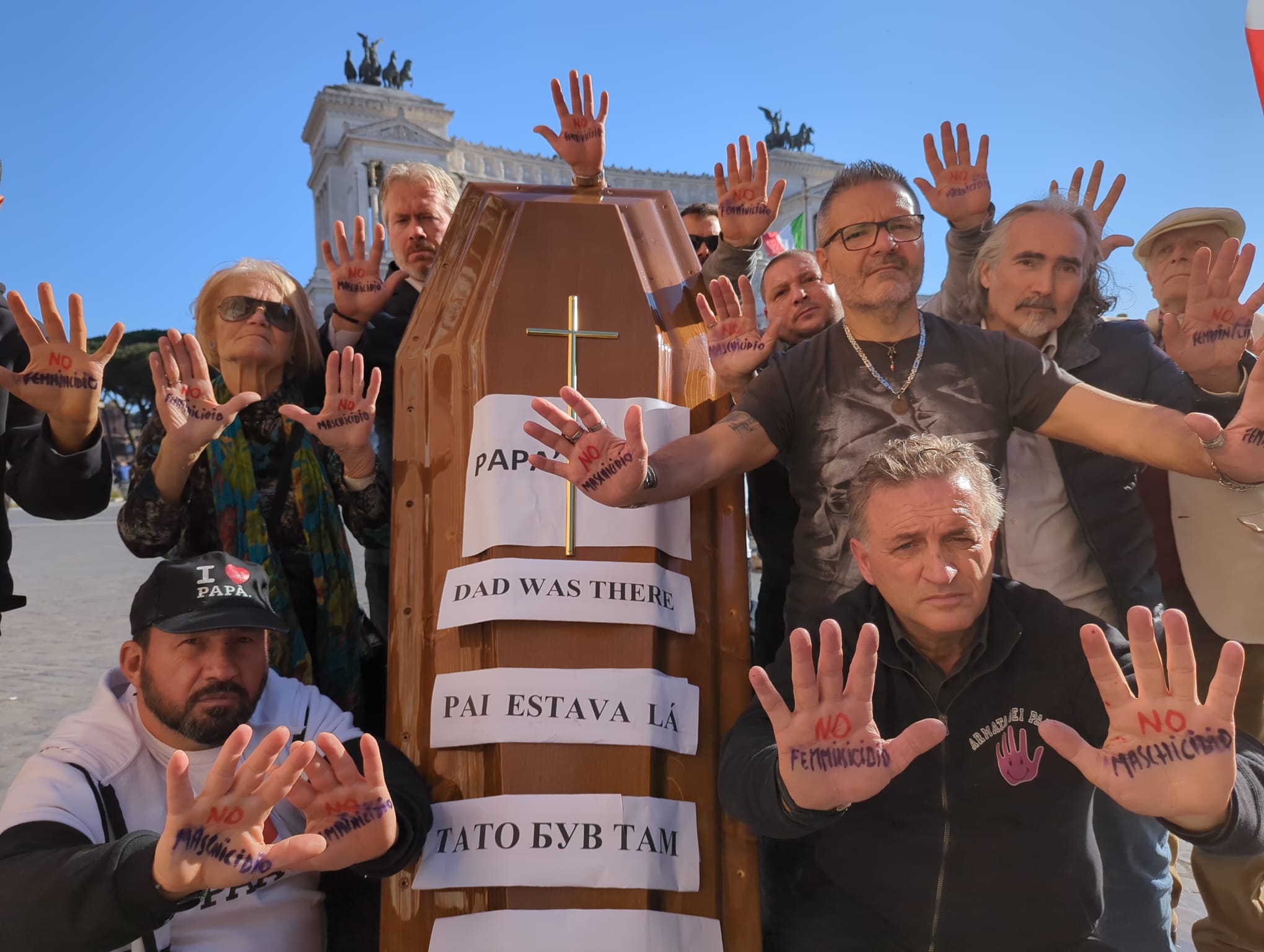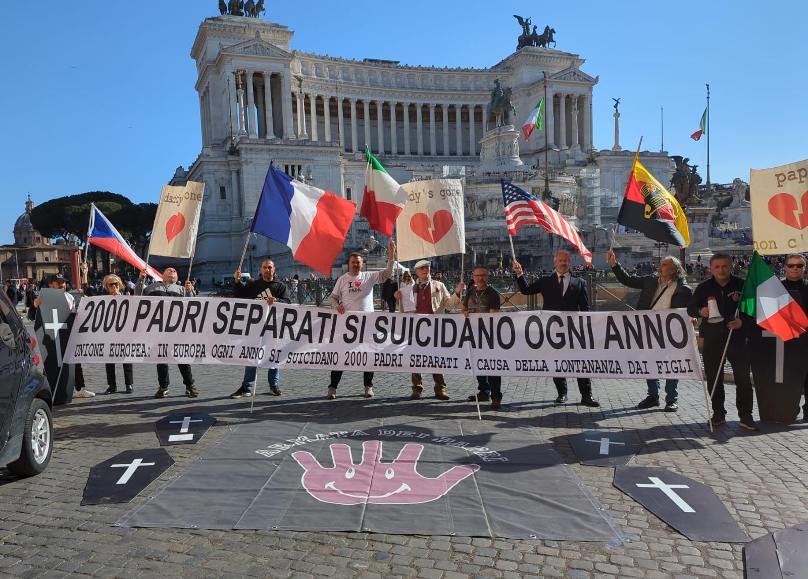 Con una vera bara in spalla, cartelli con i cuori infranti e striscioni in tutte le lingue con scritto: "Papà c'era" tanti papà hanno marciato per il centro celebrando un finto funerale, chiedendo "rispetto" ma soprattutto "più giustizia" per le tante vittime che si sono tolte la vita in tutti questi anni.