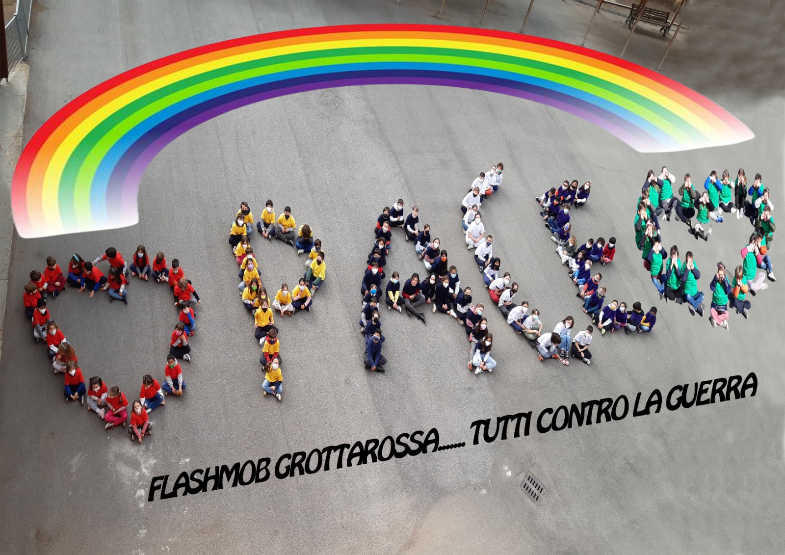 Ieri si è tenuto un flashmob di alunni e insegnanti: indossando una maglietta color arcobaleno, i bambini hanno formato la scritta "pace" e un cuore.