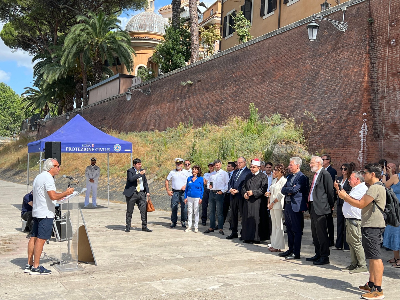 Al suo arrivo, una Vela Latina per la Pace trova riuniti i tre massimi rappresentanti delle tre religioni monoteiste di Roma: il Rabbino di Roma Riccardo Di Segni, l’Imam della grande Moschea Nader Akkad, ed il rappresentante del Vicariato di Roma, Mons. Gnavi, che – alla presenza del Sindaco di Roma Roberto Gualtieri e l’Avv.ssa Civita di Russo del gabinetto del Presidente della Regione Lazio – hanno deposto una corona di fiori nel letto del Tevere al fischio del nocchiere della Marina Militare.