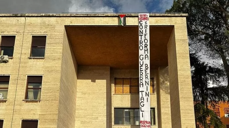 "Contro la guerra, tagli e riforma Bernini" è stato occupato il "tetto della Facoltà di Lettere" dell'Università, ed è prevista un'assemblea per le 18. Sulla facciata della Facoltà è stato posto uno striscione, con su scritto: "Israele ci porta alla guerra. Fermare Escalation". Davanti all'ingresso, inoltre, è stata messa la sagoma di un asino con la scritta "ministra Bernini".