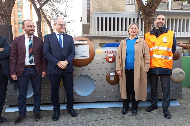 Inaugurato il prototipo di maxi-contenitore per la raccolta differenziata multifrazione, installato in Piazza Fabrizio De André alla Magliana. Sperimentato per la prima volta a Roma, con una capacità di 750 litri, grazie al suo design si armonizza con l’arredo urbano e raccoglie fino a 13 tipologie di materiali con scomparti di varia capienza.