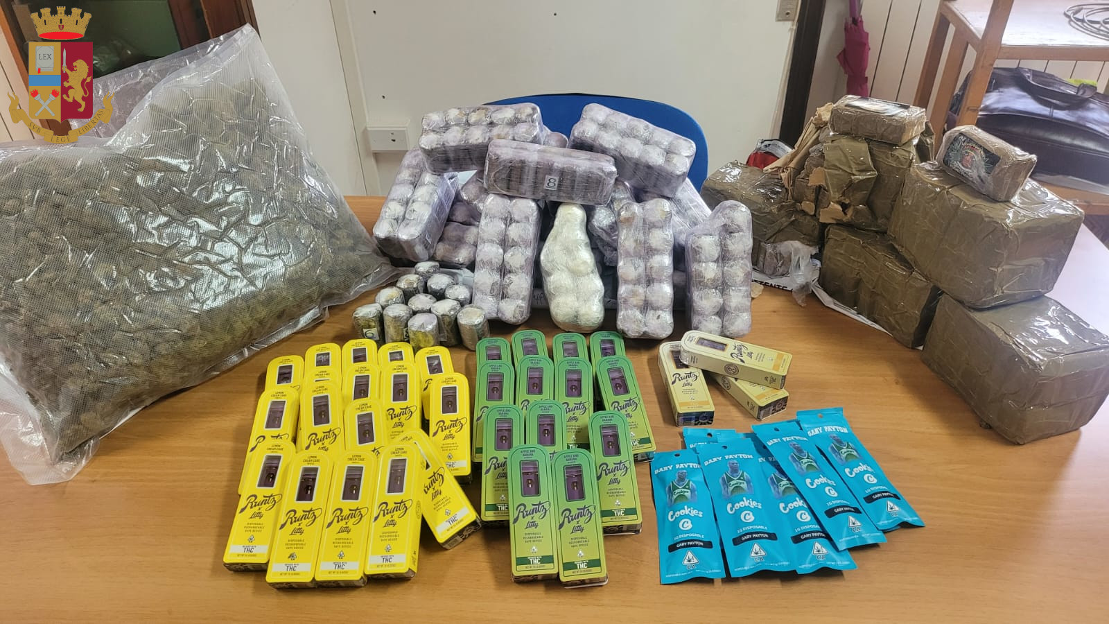 Nell’occasione i poliziotti hanno sequestrato oltre 14 chilogrammi di hashish, numerose cartucce per le sigarette elettroniche con l’indicazione della presenza in esse del principio attivo della cannabis, appunti manoscritti ragionevolmente riferibili all’attività di spaccio, copioso materiale destinato al confezionamento ed alla pesatura, nonché la somma di 230 euro in contanti.