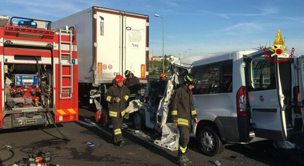 L'incidente si è verificato lungo la corsia centrale: il conducente del furgone, che viaggiava a forte velocità, non aveva visto il Tir in coda, tamponandolo con violenza.