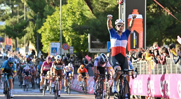 Il francese stacca Caleb Ewan sullo sprint a Scalea. Impresa del piemontese Diego Rosa, che scatta sulla salitella e se ne va da solo per 131 km.