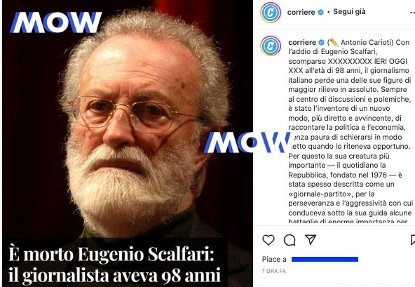 Su Mow il post del Corriere della Sera con il "coccodrillo" per Eugenio Scalfari, fondatore di Repubblica