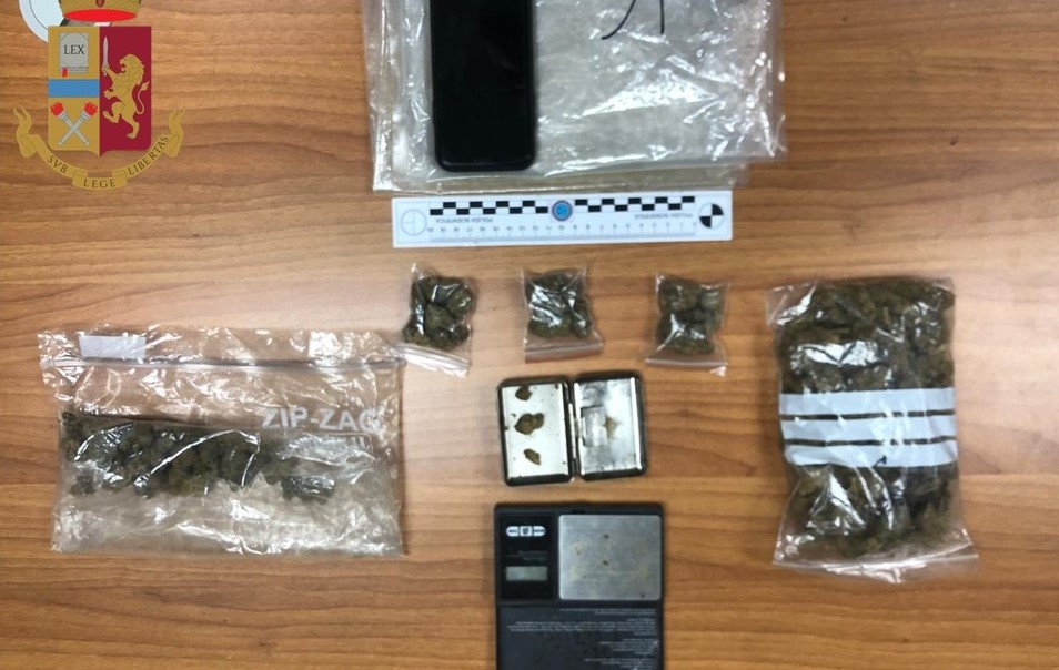 Il suo nervosismo ha confermato sempre più i sospetti dei poliziotti che, nel corso della prima sommaria perquisizione personale, hanno recuperato 3 bustine da cinque grammi l’una di marijuana ed un piccolo cofanetto con un altro mezzo grammo circa della stessa sostanza stupefacente.