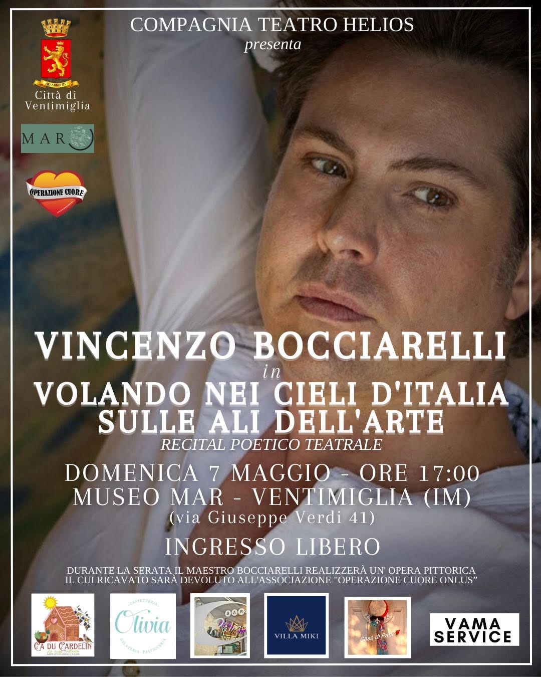 In attesa del debutto estivo a Roma , il Museo MAR di Ventimiglia apre le porte domenica 7 maggio ore 17.00 ( Sala Squarciafichi) al recital teatrale-poetico di Vincenzo Bocciarelli , dal titolo Volando nei cieli d’Italia sulle ali dell’arte, prodotto dalla Compagnia Teatro Helios.