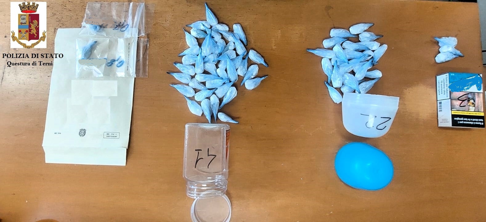 Questa volta è stato fermato: con sé aveva una cospicua somma di denaro e, in casa, sul comodino della camera da letto, gli agenti hanno trovato due barattoli in plastica contenenti 41 involucri, uguali a quelli appena sequestrati al giovane ternano, e un ovetto in plastica contenente altri 22 involucri, oltre ad un pacchetto di sigarette con dentro altri tre, per un totale di 50 grammi di cocaina.