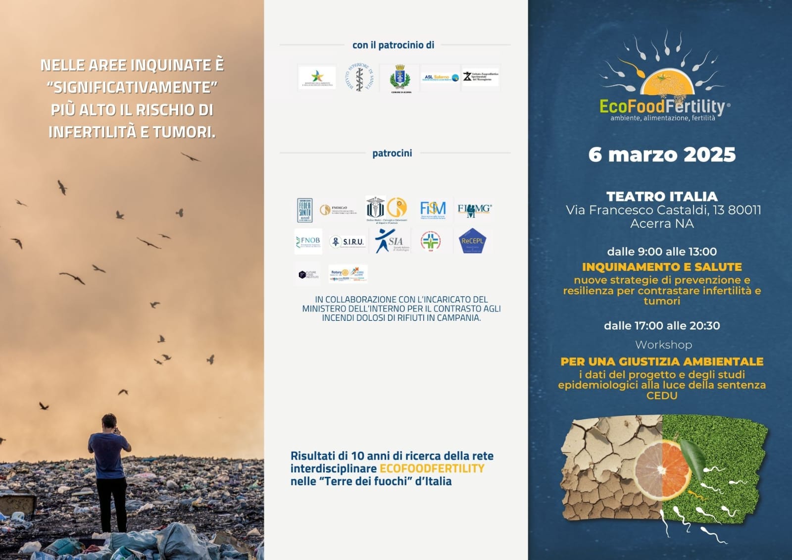 Domani 6 marzo 2025, presso il teatro Italia si terrà un convegno scientifico, organizzato da Ecofood Fertility dal titolo Ambiente e Salute. L'iniziativa verrà svolta in modalità mista, ospiterà esperti della rete interdisciplinare per la salute ambientale e riproduttiva, che presenteranno risultati, nuove linee di ricerca e prospettive. Interverranno Luigi Montano, Luigi Montano uroandrologo ASL Salerno e coordinatore progetto Eco food fertility, nonché presidente società italiana della riproduzione umana; Michele di Bari, prefetto di Napoli; Lucia Volpe, prefetto di Caserta; Tito D'Errico, sindaco di Acerra; Monsignor Antonio di Donna, vescovo di Acerra; Generale Giuseppe Vadalà, commissario unico per la bonifica della Terra dei fuochi e Ciro Silvestri incaricato, del ministro dell'Interno per terra dei fuochi. In Italia, lo studio SENTIERI dell'ISS (Istituto Superiore di Sanità) ha evidenziato un aumento di tumori e malattie croniche nelle aree contaminate, confermando il legame tra inquinamento e salute pubblica. Esistono forti disuguaglianze sanitarie anche tra territori vicini. La raccolta di dati sui tumori e altre malattie croniche con lunga latenza rappresentano informazioni indicative, utili per la programmazione sanitaria, quando vengono trasmessi in tempi ragionevoli, Mara rappresentano, comunque, dati di esito di processi di lunga esposizione, rendendo complessa l'identificazione delle cause. Gli inquinanti chimici e fisici, insieme a cattivi stili di vita, rappresentano una grave minaccia per la salute pubblica i cui effetti sono anche trans- generazionali. Il sistema riproduttivo è particolarmente vulnerabile: l'OMS (2023) stima un'infertilità di coppia del 17,5% , mentre una meta analisi segnala un calo del 62,3% della conta spermatica tra il 1973 e 2018, con un'accelerazione nei paesi più inquinati. E' quindi essenziale passare dalla semplice osservazione degli esiti patologici alla rilevazione precoce dei danni, per avviare azioni concrete di salvaguardia attiva della salute pubblica, in particolare, per le nuove e future generazioni. Il progetto Eco food fertility, attivo da 10 anni, utilizza biomarcatori riproduttivi per identificare i primi segni di danno ambientale e proporre nuove misure di prevenzione e resilienza. Studi condotti nelle aree più esposte hanno evidenziato un incidenza significativa di alterazioni Nella qualità seminale dei giovani sani. Lo stesso progetto apre a strumenti innovativi per il bio monitoraggio, la sorveglianza sanitaria, e la prevenzione, per la tutela della fertilità e della salute generale. L'evento assume un'importanza ancora Maggiore alla luce della recente sentenza della corte europea dei diritti dell'uomo sulla Terra dei fuochi, che ha riconosciuto l'inazione dello stato italiano è imposto misure di risanamento ambientale.