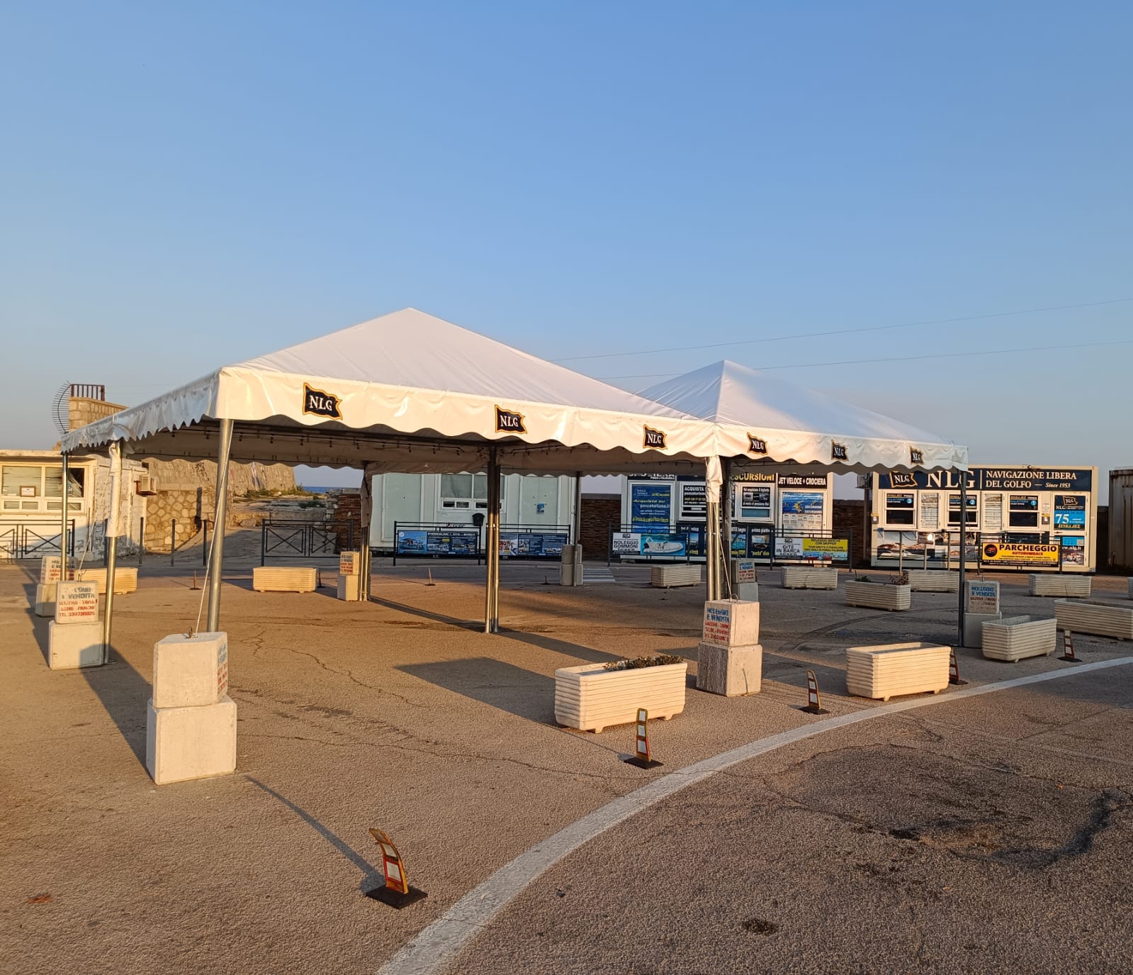 (Foto: La tendostruttura realizzata dalla NLG presso l'imbarco turistico del porto di Terracina)
