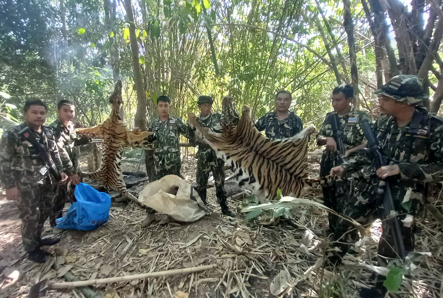 Le prove includevano due femmine di tigre del Bengala uccise, un fucile, cinque cartucce di fucile, due fucili fatti in casa, 176 cartucce, due bottiglie contenenti polvere da sparo, un sacchetto di polvere da sparo, un fucile carico, una busta di pacchi indirizzata a Dao Khongjitvivat, un pacchetto di pillole per la pressione sanguigna con il nome di Mrs Jorpae e 22 bombe “ping-pong”, ha detto Charoen.