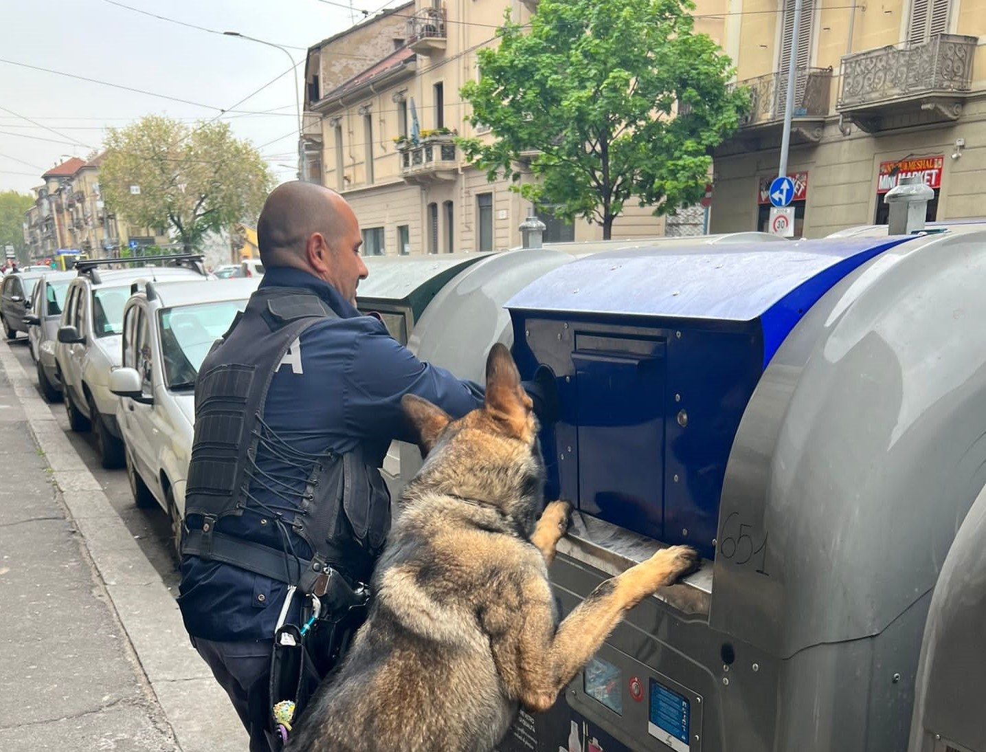 Difatti, dopo aver rinvenuto un tocchetto di hashish per terra, in corso Palermo, fra il marciapiede e le ruote di una vettura parcheggiata, il cane poliziotto ha fermamente rivolto la sua attenzione ad un cassonetto per la raccolta del vetro posto sul lato opposto del corso.