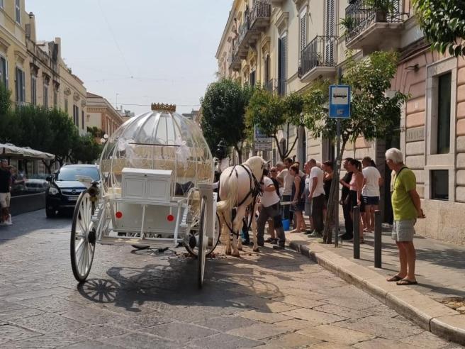 Un cavallo che trainava un calesse su cui sedevano due sposi si è accasciato sull’asfalto, stremato dal caldo. Camminava lungo corso Vittorio Emanuele, a Trani, cittadina pugliese in questi giorni diventata bollente come molte altre città d’Italia.
