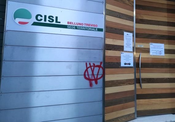 Treviso, vandalizzata sede della Cisl, simboli no-vax all'esterno