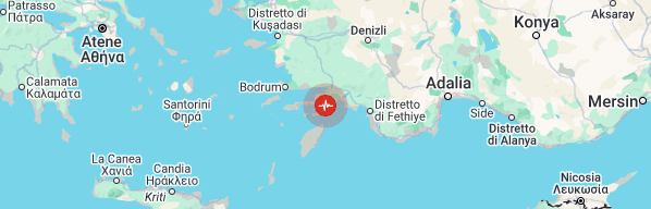Terremoto di magnitudo 5.8 registrato nel Mar Egeo, tra la Turchia e le isole greche del Dodecaneso, questa mattina, 3 giugno 2025, alle ore 2,17 ora locale. Lo riporta il Centro Sismologico Europeo-Mediterraneo. Secondo tale rapporto, l'epicentro è stato localizzato 17 chilometri a sud-est della città turca di Marmaris, che conta circa 38mila abitanti, a una profondità di 68 chilometri (posizione 36.706 ; 28.241) Non si sono registrate al momento vittime o danni. È stato invece diramato un allarme per un possibile maremoto (tsunami).