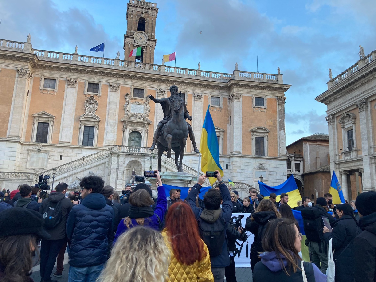 Sono moltissime le persone accorse in Piazza del Campidoglio, a Roma, per partecipare alla fiaccolata per la pace in Ucraina. Gran parte dei partecipanti sono di origine ucraina, ma molti sono anche gli italiani scesi in Piazza per dimostrare la propria solidarietà.