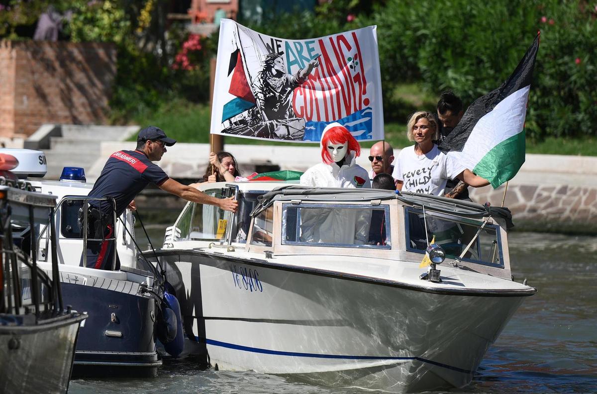 E' stata fermata al Lido di Venezia, poco prima del suo approdo all'Excelsior, la lancia con Laika e Anna Foglietta che stavano presentando l'ultima opera della street artist, intitolata "We Are Coming", a sostegno dell'operato della Global Sumud Flotilla.