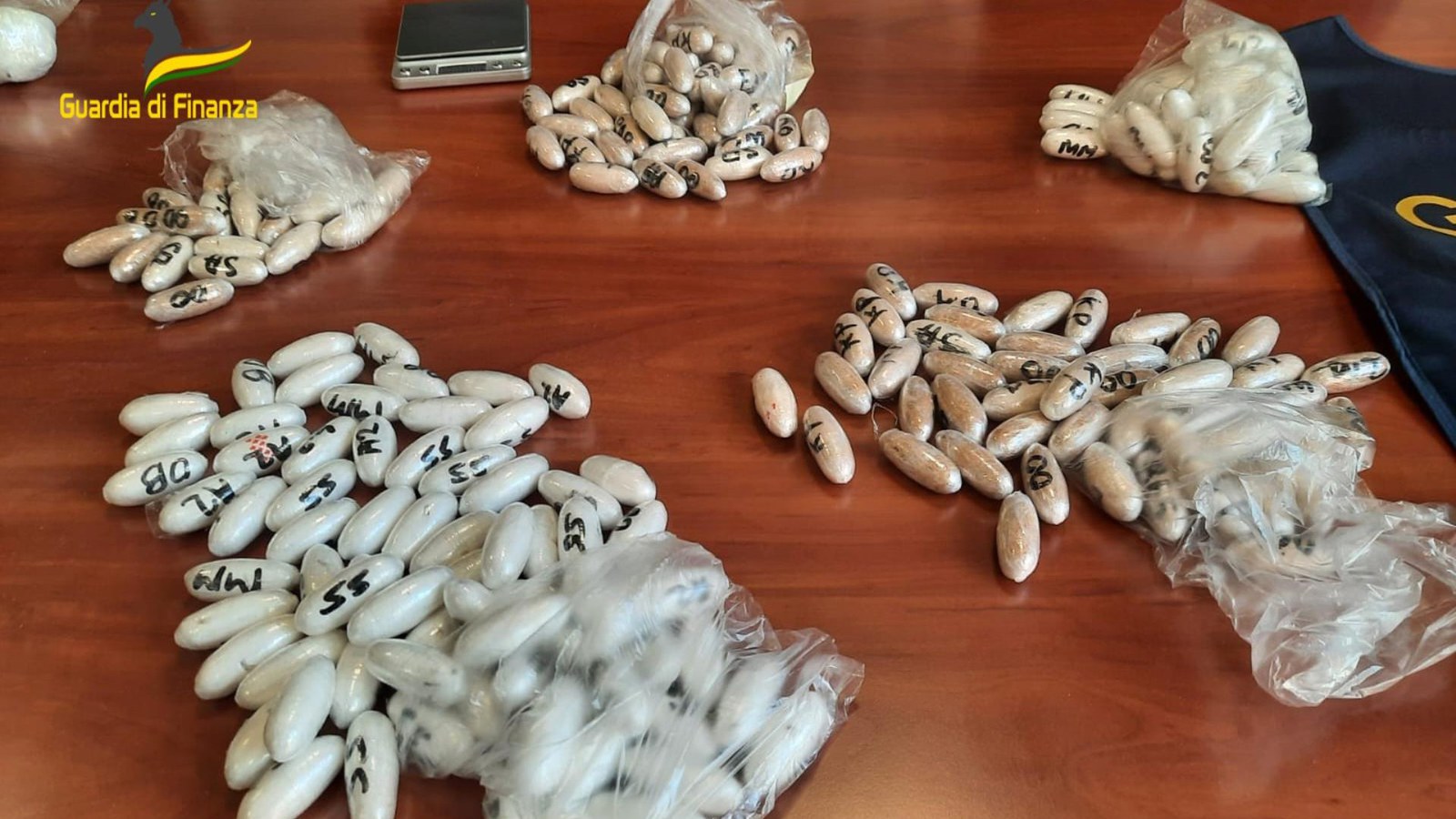 L’ispezione della borsa confermava i sospetti delle fiamme gialle, che rinvenivano 276 ovuli e 7 “pepite” di forma irregolare risultati poi contenere un totale di oltre 1.438 grammi di cocaina purissima e 1.870 grammi di eroina.