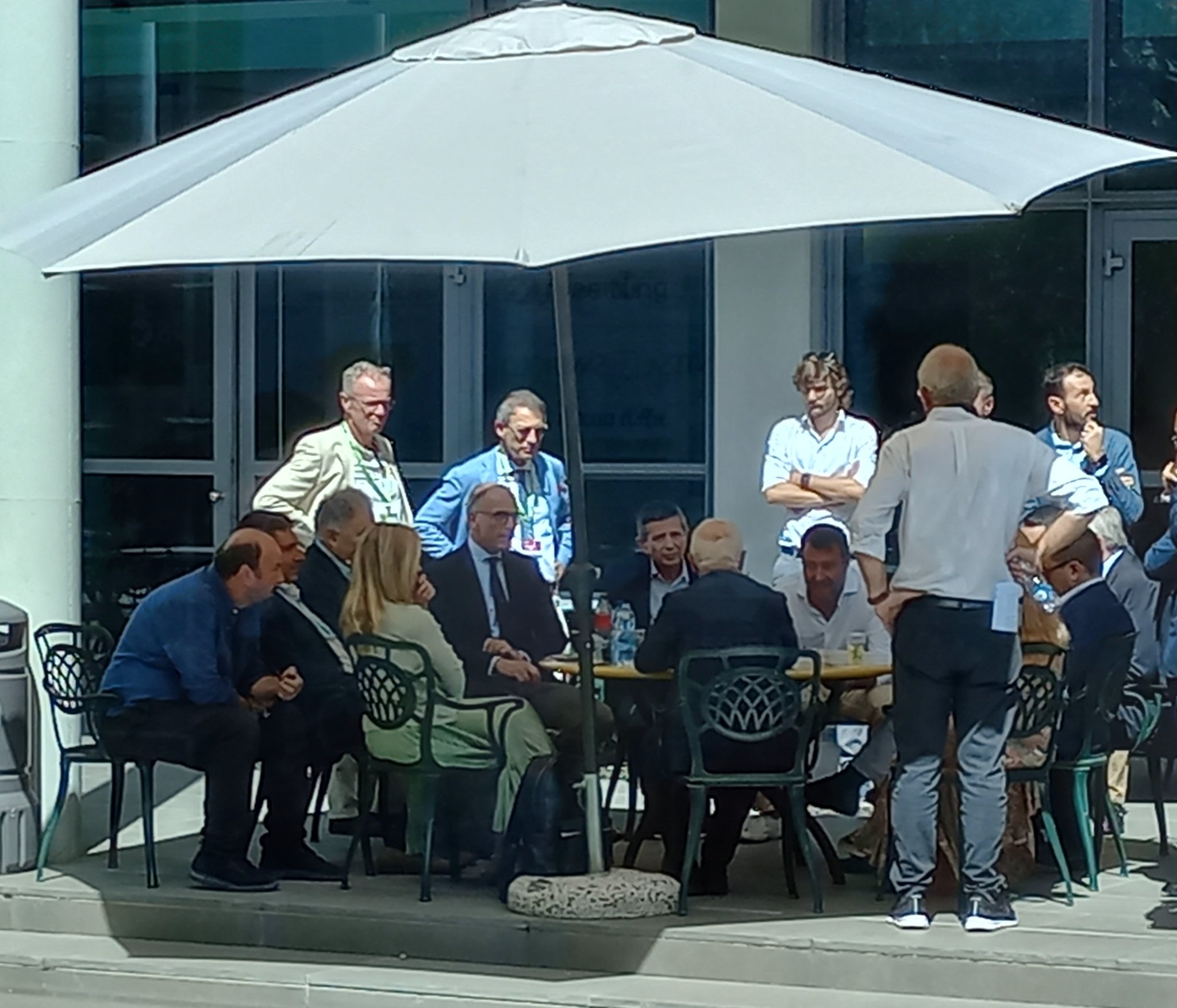 L'obiettivo del collega Luciano G. ha immortalato tutti insieme attorno ad un tavolo per un aperitivo o altro? Siamo a Rimini, sono tutti a discutere delle regole di ingaggio prima del dibattito al meeting di Rimini di Comunione e Liberazione, tutto sotto gli occhi di decine di giornalisti e di telecamere.