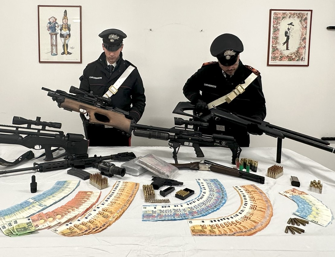 Rinvenuto anche un “arsenale”, tra cui una pistola con matricola abrasa, un fucile a canne mozze risultato smarrito, un fucile d’assalto risultato rubato, 4 fucili, una balestra, un arco professionale, circa 7.000 € falsi e 4.000 € veri, ed oltre 200 munizioni di vario tipo.